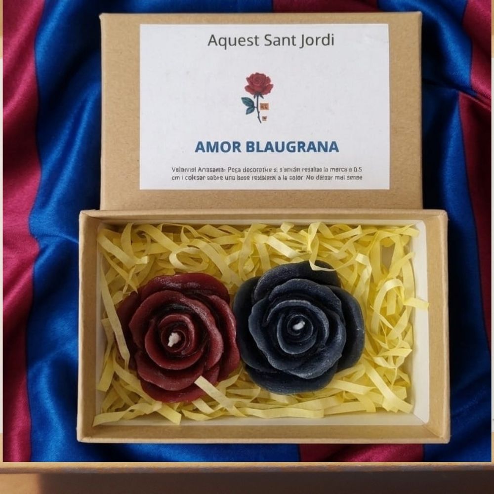 - Pasión y artesanía: Pack de dos rosas (azul y grana) elaboradas a mano con cera de abeja 100% natural.