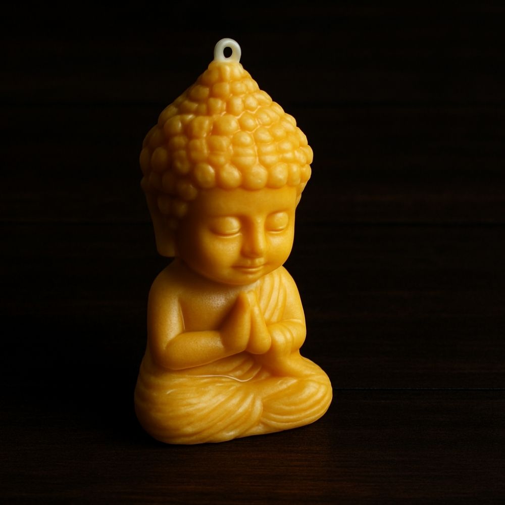 Vela artesanal con la figura de Buda, elaborada con cera de abeja 100% natural. Un símbolo de paz y serenidad para iluminar tus momentos de meditación o decorar con sentido.